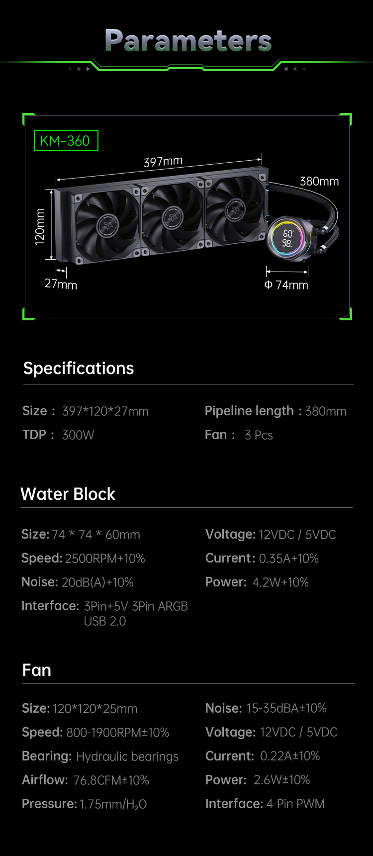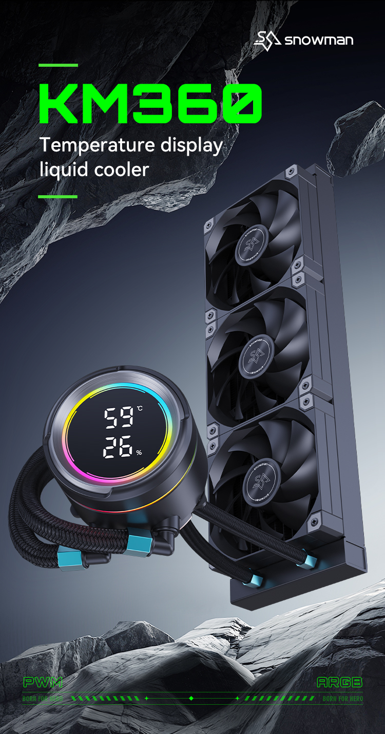 KM360-ARGB 数显版一体式水冷,采用全新的段码屏设计,将极致性能与科技美学完美融合,带来革命性的散热解决方案。KM360-ARGB 数显版围绕水泵顶盖加入了ARGB 氛围灯,提升了整体的视觉吸引力。