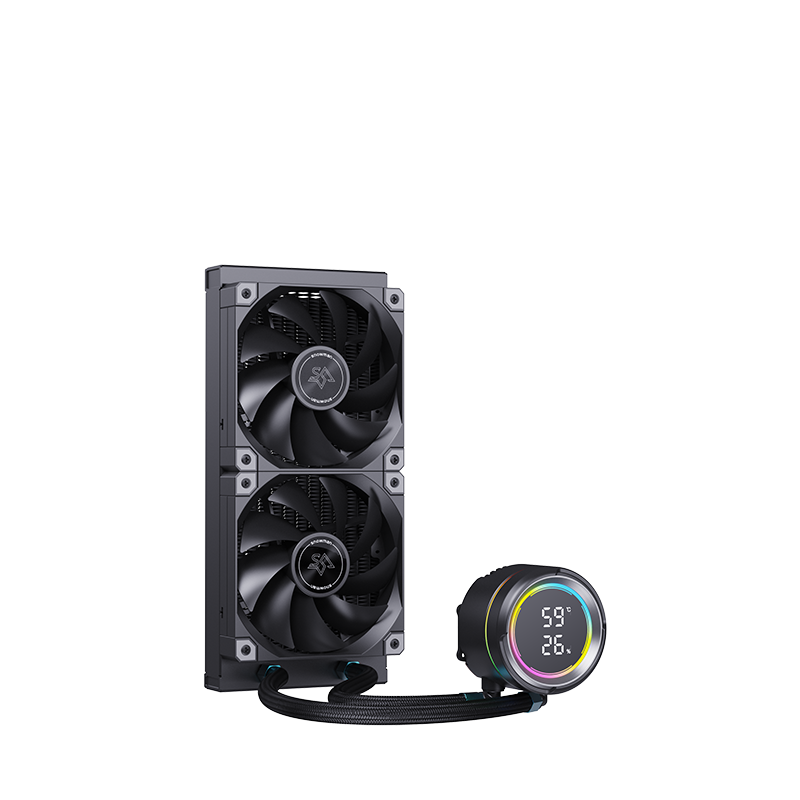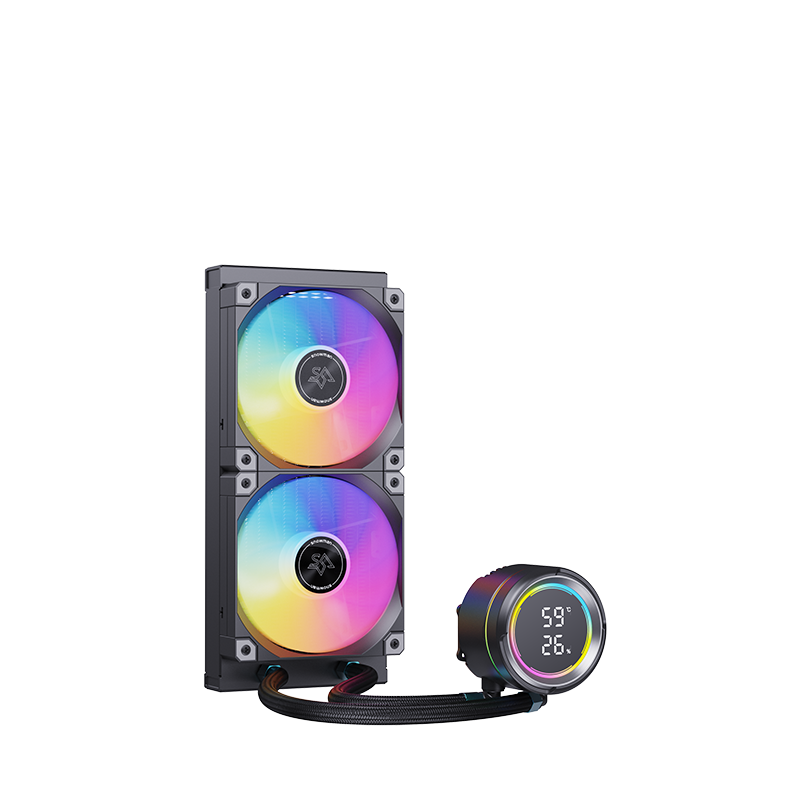 KL240-无灯 数显版一体式水冷,采用全新的段码屏设计,将极致性能与科技美学完美融合,带来革命性的散热解决方案。KL240-无灯 数显版围绕水泵顶盖加入了ARGB 氛围灯,提升了整体的视觉吸引力。